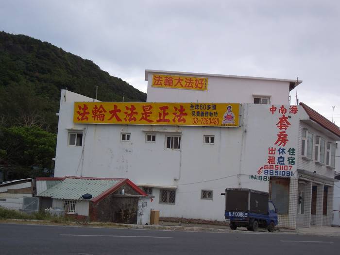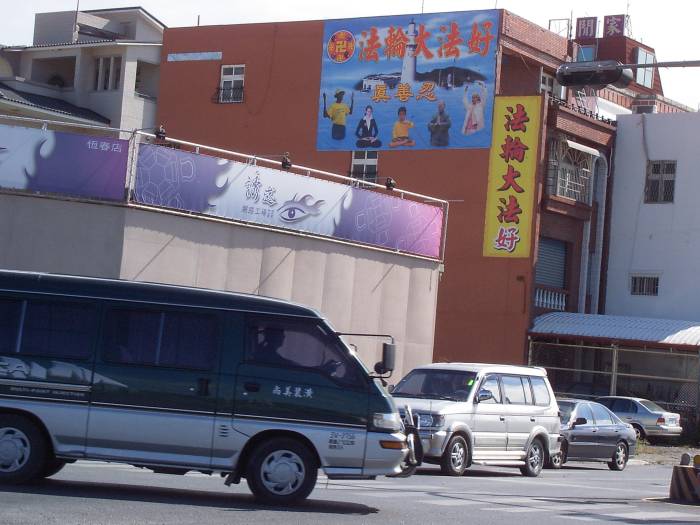 【明慧网2003年12月30日】这是台湾前往垦丁观光景点大法洪传与审江的看板,每天都有很多中国游客。