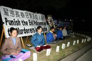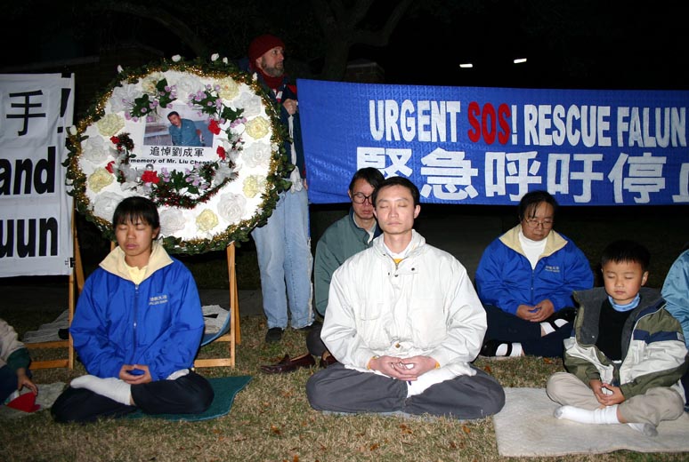 休士顿法轮功学员在中领馆(官邸)前的草坪上举行烛光守夜,为刘成军送行,同时,强烈要求严惩罪恶之首江泽民,以及长春恶警和杀人凶手。同时也希望全世界正义之士,谴责江氏集团的对善良民众的暴行,终止这场对坚持真善忍信仰的法轮功学员的迫害、摧残和虐杀,支持和平理性的法轮功学员坚持真理、揭露谎言的正义行为。