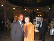 | 游客驻足观看法轮功在中国和世界受到褒奖的图片 | 学员与州务卿 Jesse White 先生合影 | 学员向游人介绍法轮功受迫害的真相 |