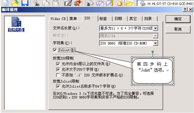 第四步:选中“ISO”菜单。再钩上“Joliet (B)”选项。点击右上角的“确定”按钮,退出这个介面。