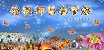 在此新春佳节之际,全体沈阳大法弟子向我们至尊至善的师父拜年:师父新年好!三年多来,众大法弟子坚强不屈的走过了风风雨雨,变得更加成熟与理智,事实已证明一切:无论艰难险阻都无法将大法弟子们与师父、大法相隔断!在新的一年里大法弟子们会一如既往的运用各种不同方式做好正法时期弟子们应该做的事,以创和师父团聚、普天同庆的美好时刻早日到来!