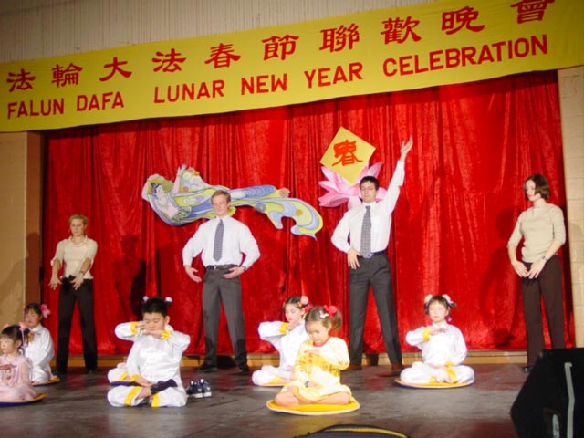 晚会的节目丰富多彩,除了歌唱、民族和古装舞蹈等各式传统中国节目外,还有西人法轮功学员为观众献上的中文歌曲――“拜年歌”和“为你而来”。一位西人学员――加拿大著名演员麦克尔.莫侯南自编自导了一出哑剧,和几位中国学员一起用表演的形式向观众展示了一个西方年轻人的生命历程:从迷茫困惑的人生通过大法修炼走向了新的生活,当知道自己的同修在中国因为修炼真、善、忍而遭到迫害后,他走上街头,分发传单,告诉大家迫害的真实情况。最后远到中国去告诉可贵的中国人西方人对法轮功的珍惜,并走向了天安门,在广场上大声喊出他的心声“法轮大法好”!整个哑剧以这发自内心的呼喊结尾,赢来了满场观众的掌声。