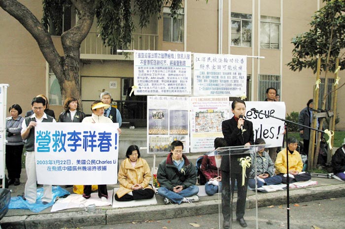 【明慧网2003年2月1日】一月三十日,旧金山湾区的法轮功学员在旧金山中领馆前召开了营救美国公民、法轮功学员李祥春(查尔斯·李)的新闻发布会。美国广播公司(电视)、哥伦比亚广播公司(电视)、新唐人电视台、旧金山纪事报、圣荷西水银报、大纪元时报、圣马刁郡报、自由亚洲电台、湾区之声中文电台等多家中、英文媒体到场进行了采访。