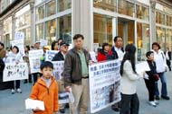 ![]() 法轮功修炼者们星期四在州议会前举行新闻发布会期间演示他们功法的五套动作,他们身后是描述众多暴行事例的海报。 |