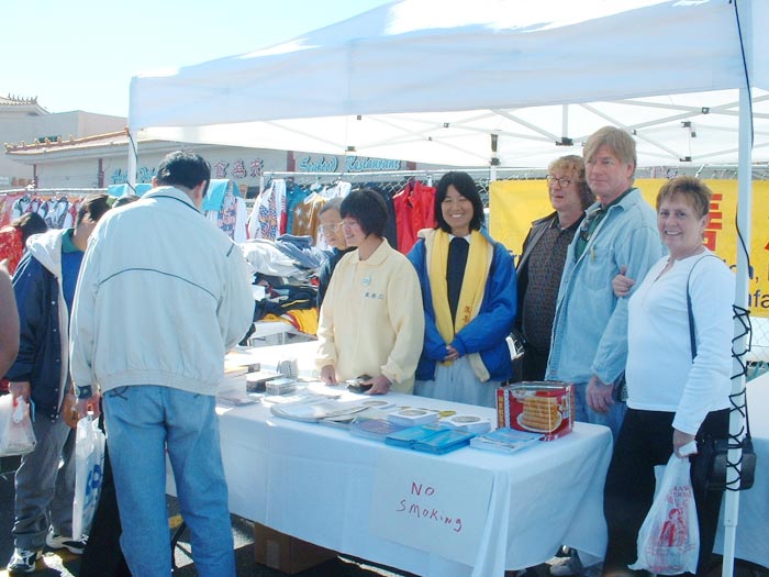 今年的摆街会参观的人特别多,从早上十点到下午五点,整个中国城被挤得水泄不通,法轮功学员抓住机会快讲。