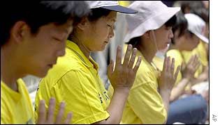 英国广播公司2003年2月15日报导,上百名法轮功成员周六(2月15日)在香港立法会大楼外抗议港府推动反颠覆法进入立法程序。