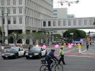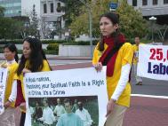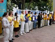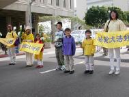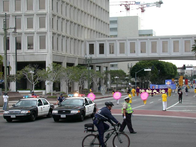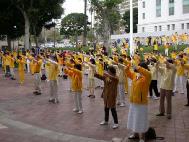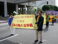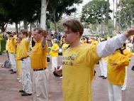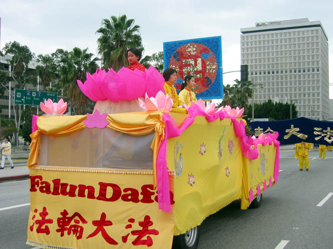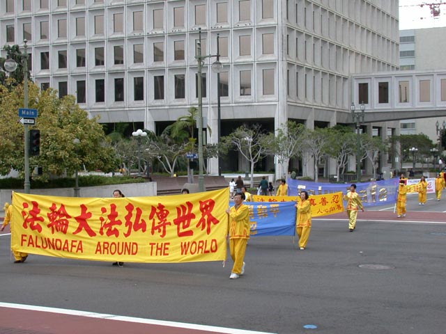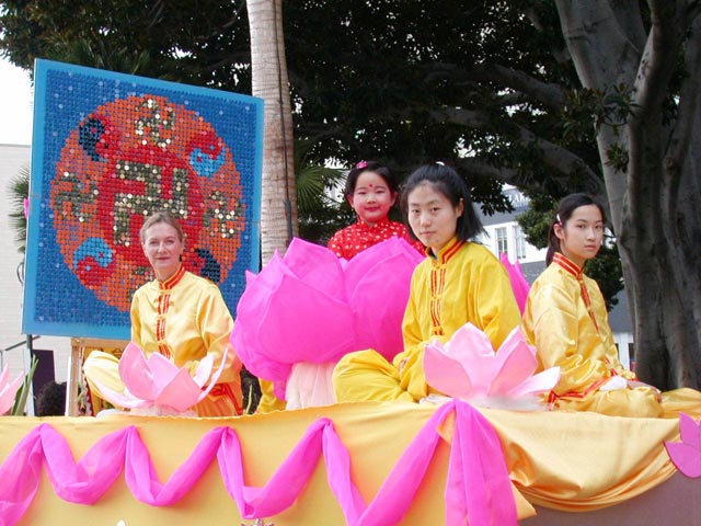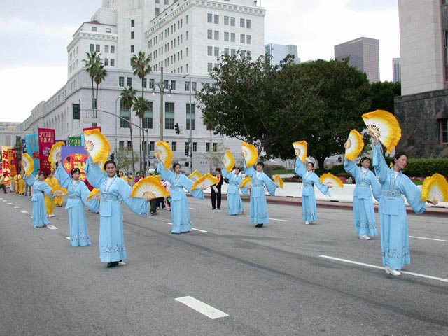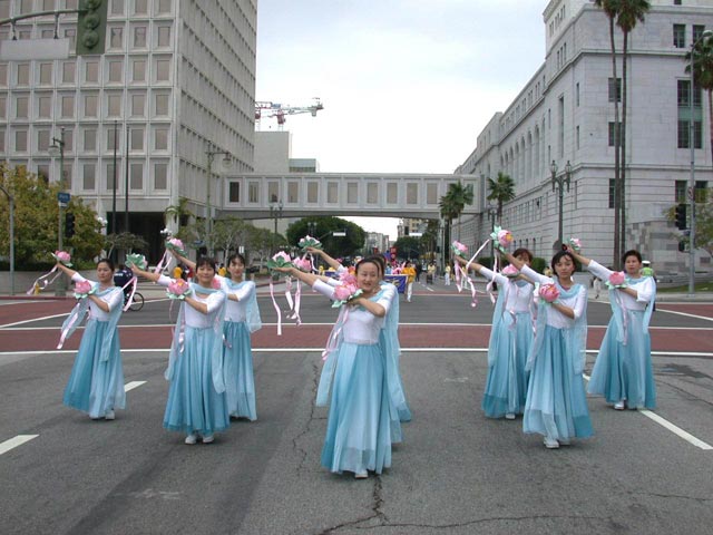 法轮功学员在游行中表演舞蹈