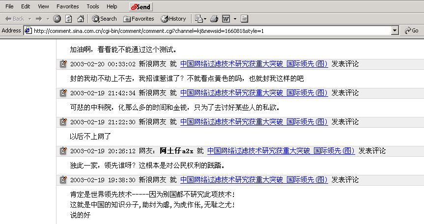 许多网友不相信政府的信息,并也学会了自己想法对付政府的封锁,有一个网友说,“(这一技术)不过仅仅基于文本,怎么著都没法防住的,上次收了封信,就是一个gif图片,里面一个flg小报,直接扫描的。对这样的信,恐怕内容过滤也是没有办法的。互联网不需要过滤,我们需要一切信息,过滤留给个人的大脑干吧。中国政府少操心。”另有网友推荐用代理服务器,他说:“我用免费代理服务器,天天看敏感的网站。一点事也没有。”还有人指出,“中国政府99年镇压法轮功,而这一研究在9年前就开始了,是不是政府早就有预谋?”对于政府想要过滤的言论,有网友说,正因为如此,他才开始认真的思考这些言论。