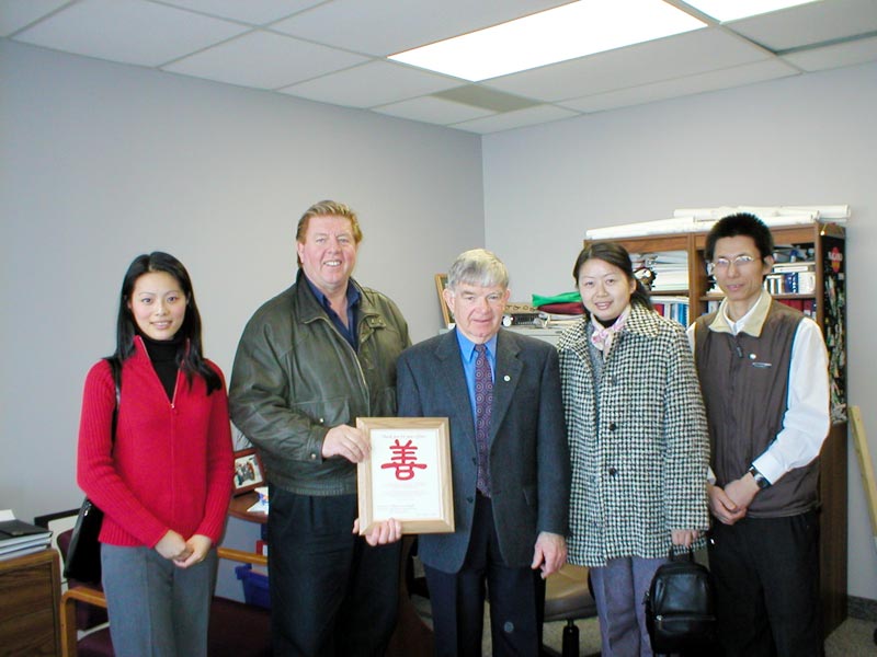 法轮功学员邱楠楠代表被加拿大政府营救出劳教所的父亲、弟弟和其他法轮功学员向市长先生表示了最真诚的谢意,并赠送了由学员设计和制作的感谢奖状,奖状上是学员的剪纸作品“善”字。当他接过奖状时,我们看到了他的眼睛里闪烁着感动的泪花。
