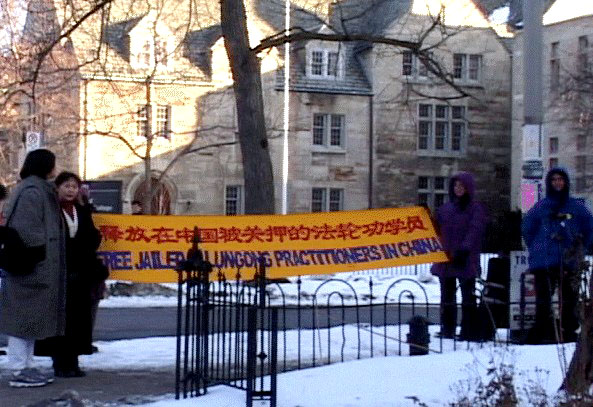 【明慧网2003年2月24日】一个中国官方的高级宗教代表团原定与加拿大有关方面举行关于宗教信仰自由的“闭门会议”。多伦多大法弟子及一些人权团体,在多伦多开会的地点进行和平请愿,但是,有关方面在得知消息后,临时紧急取消了此会议。2月21日星期四早上八点半,多伦多的法轮功学员、中国人权民运组织、西藏人协会的代表,聚集在多伦多大学神学院外面,向到访的中国官方宗教代表团请愿。
