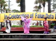 接着,大法弟子伴着优美的炼功音乐,进行了1-5套功法演示,还表演了唐装服饰舞、普度舞蹈、电子琴演奏、女声小合唱及西人弟子自编自演的“真、善、忍”二人弹唱等节目。游客及市民均被精彩表演吸引驻足观看,人们边鼓掌边说,“太好了,真优美。”更有抓住珍贵的机会,拍照和录像的。当表演一开始,雨便停了,一直到下午2点半钟庆祝活动结束。精彩的表演,祥和的场,甚至连和平鸽也都吸引来,停息在路边屋檐,倾听美的旋律。