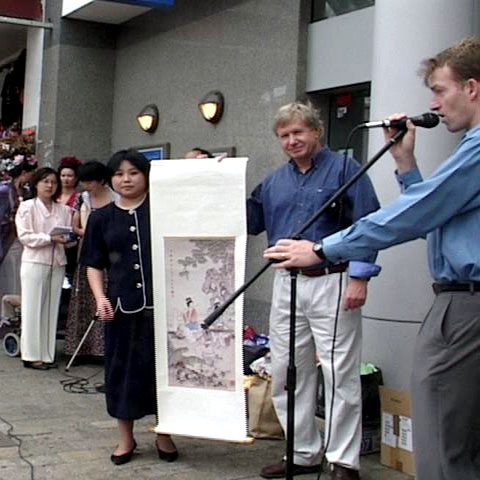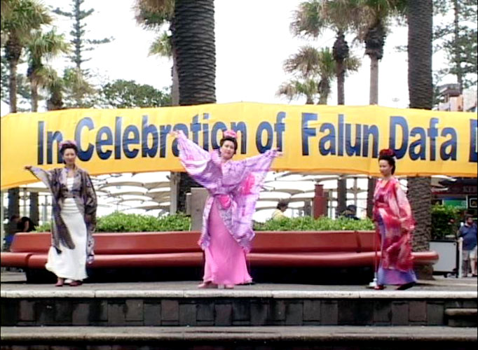 从演出现场的扩音器里不时传来大法弟子对法轮大法的简短介绍,“法轮大法是一种古老的中国气功。他遵循宇宙最高特性--“真、善、忍”修炼,有益身心,祛病健身,深受人们喜爱和珍视,已洪传六十多个国家和地区,修炼者达一亿人………”