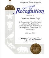 加利福尼亚州众议院褒奖令授予加利福尼亚法轮大法褒奖你们在“真善忍”法理的指导下致力于在社区内促进身体健康。