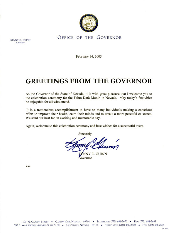 【明慧网2003年2月26日】内华达州州长(KENNY C. QUINN)为首届内华达州法轮大法月庆祝活动发来贺信
