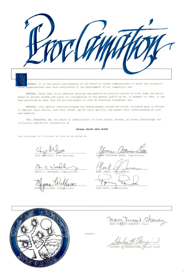 【明慧网2003年2月26日】美国内华达州克拉克(Clark)郡委会宣布2003年2月为内华达州法轮大法月。