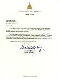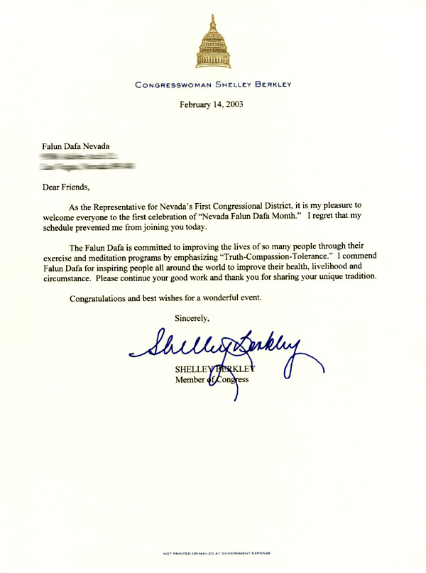 【明慧网2003年2月27日】美国内华达州众议员雪利-柏克利(Shelley Berkley)为首届内华达州法轮大法月庆祝活动发来贺信。