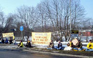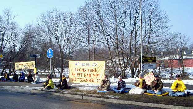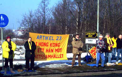 【明慧网2003年2月27日】2003年2月25日上午,瑞典哥德堡市及周围城市部分大法弟子来到中国驻哥德堡领事馆前,抗议香港在回归几年后,无视香港人民的民主自由,拟立恶法第23条。由于中国领事馆坐落在工业区,因此来往的车辆很多。司机们对中国江政府一伙