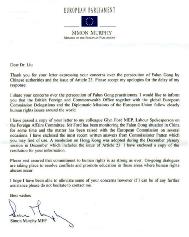 与你一样,我关注法轮功学员所遭受的迫害。我谨想让你知道:英国外交部与全球欧洲议会代表团和欧盟外交使团一道密切关注着世界的人权问题。