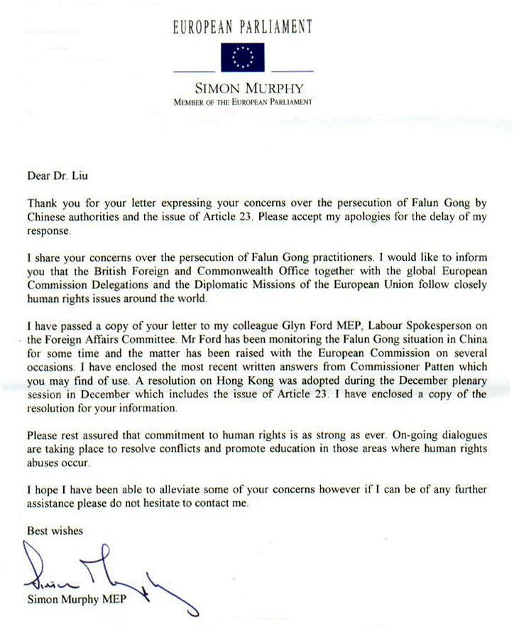 我已经把你的来信转给我的同事、外交委员会工党发言人格兰福特(Glyn Ford)议员。福特先生关注法轮功在中国的状况已有一段时间了,法轮功事宜已多次在欧洲委员会上提出。随信请见(议会)专员彭定康先生最近一次的书面回复,也许对你有用。关于香港23条立法,欧洲议会在去年12月的全体会议上通过了一项包括关于香港23条立法议案的决议,随信请见决议的副本作为参考。