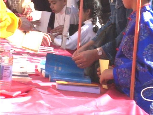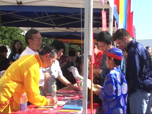 2003年2月1日(大年初一)上午10时至下午4时,中化文化中心在该中心停车场举办欢庆春节园游会。当地很多华人社团参加,也有美国一部分大公司参加。园游会上有卖中国工艺品,有各种小吃,还有民族特色的表演等等。我们的展位靠近入口处,吸引了众多游人,不断有游人询问和索取有关法轮大法的资料。