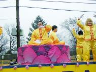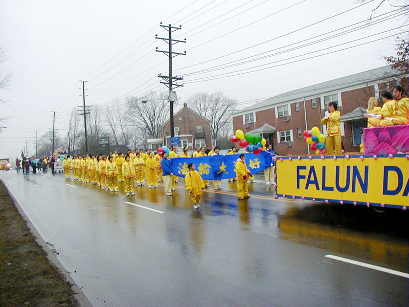 【明慧网2003年2月3日】2003年2月1日大年初一,法轮功学员参加了由二十几个华人团体举行的美国新泽西州华人春节游行。游行的宗旨是向西方社会弘扬中华传统文化,而修炼又是中华传统文化的精髓部份。大法修炼更具有更深的内涵。同时,学员们也把参加华人游行看作是一个很好的向广大华人展现大法弟子的风貌,证实法的机会。经过了多日的精心准备,学员们把“为你而来”扇子舞,花车和功法表演展现给美国官员、游行组委会和广大观众。得到观众们的一致好评。