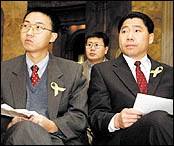 ![]() 武铁(左)和约翰-周星期五在于州议会大楼举行的新闻发布会上聆听其他法轮功学员陈述他们在中国的遭遇。 |