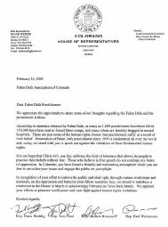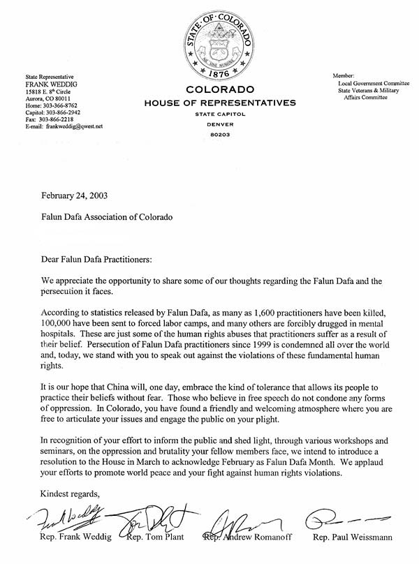 你们通过各种讲座和专题讨论会向人们讲真相,揭露你们的同修所面对的压迫和暴虐。为表彰你们的努力,我们准备在三月份向州众议院提出一决议案,宣布二月为法轮大法月。我们赞赏你们为促进世界和平和反对人权侵犯而做的努力。