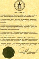以下为密苏里州奥法隆市(City of O'Fallon)对法轮大法的褒奖:褒奖鉴于,法轮大法是一个通过功法锻炼、打坐和法理提高心性、身体和精神健康的途径;并且鉴于,法轮大法以其缓慢和令人放松的五套功法最为著称,她简单柔和,但对促进身体健康非常有效;并且鉴于,法轮大法的教导的基石是“真、善、忍”三个法理,法轮大法修炼者相信这三个法理是宇宙的最根本的特性;并且鉴于,修炼法轮大法是依照这些法理向内修炼自己,努力在任何时候,任何形势和任何环境下都按照这些法理生活。