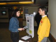 当学员们把“帮助美国的Dr. 查尔斯-李”的宣传板立起来之后,立即吸引了很多学生。他们对中国政府的做法非常诧异和气愤。很多人毫不犹豫地拿起笔签上了自己的名字。有的学生当即拿走很多传单帮助我们散发。一位美国学生的家长路过活动中心刚好看到了我们的展板,仔细阅读了之后马上签上了自己的名字。