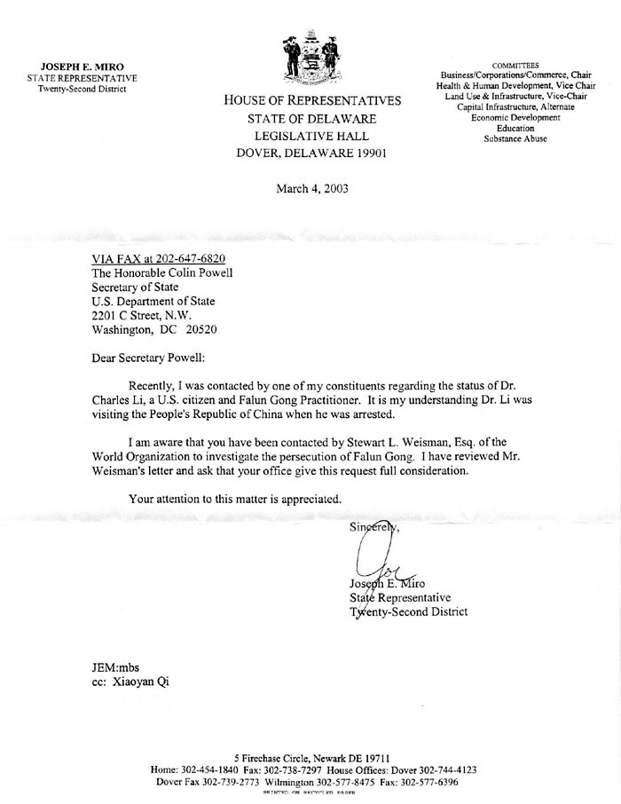 最近,我选区的多位选民就美国公民,法轮功学员李祥春的情况跟我联系。据我了解,查尔斯.李是在回中国探亲时被抓的。