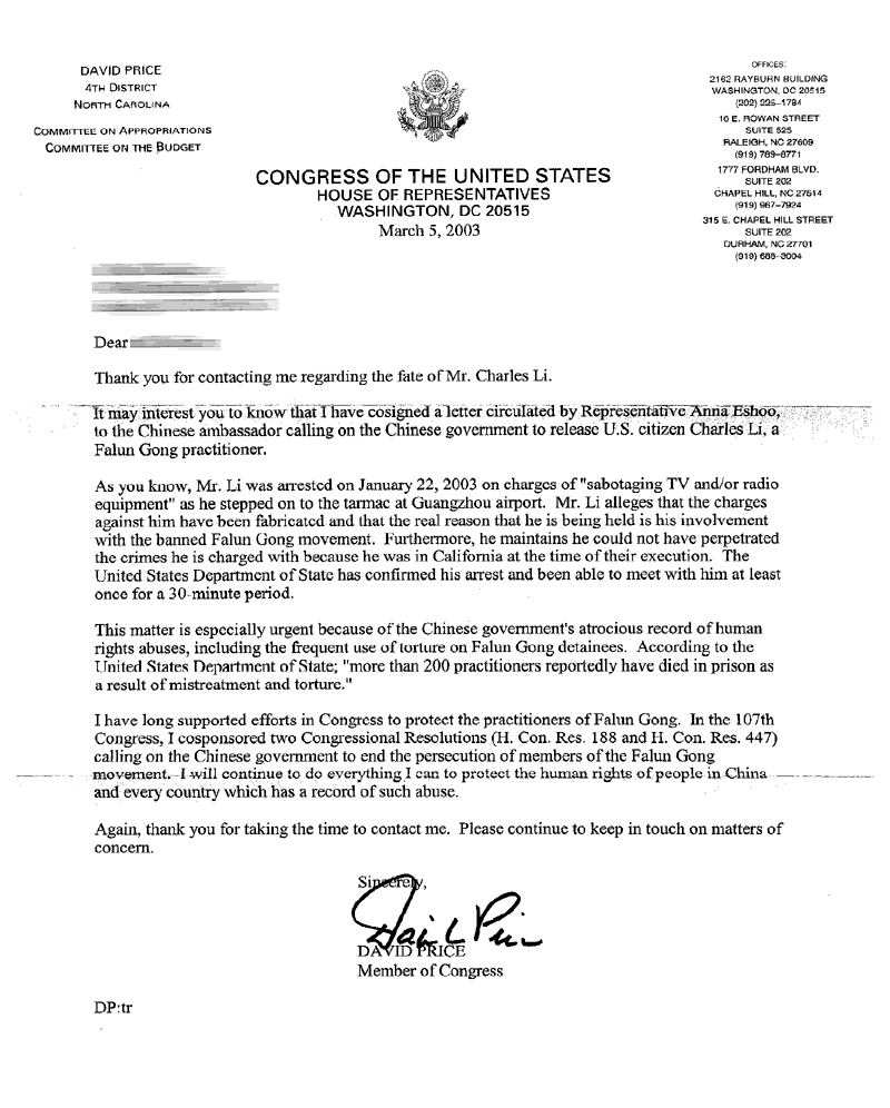 我已经联名签署了一封由国会议员安娜-伊苏发起的给中国大使的信,呼吁中国政府释放法轮功修炼者,美国公民查尔斯-李。