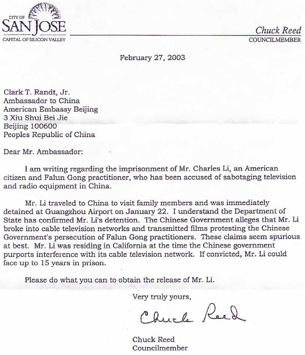 李先生于2003年1月22日旅行探亲到中国,刚抵达广州机场就立即被抓。我知道美国国务院已核实了李先生的被拘押。中国政府宣称李先生曾介入插播有线电视以抗议中国政府对法轮功学员的迫害。这些指控看来最多也无非是无中生有,因为中国政府声称有线电视被干扰的当时,李先生身在加州。如果李先生被判有罪,他将面临高达15年徒刑。