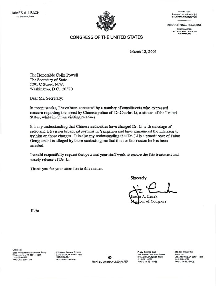 加州迩温世界新闻2003年3月13日报导,一个支持1月份在中国被抓的美国公民的团体星期二晚请求市议会的支持,敦促议员们帮助使他获释。在市议会会议的公众评论部份两位发言人说,旧金山的李祥春是因为修炼在中国被[江氏集团]禁止的法轮功而被抓,他没有做任何错事。这七人乘一辆面包车沿着加州海岸线上下奔波,请求市议会们在给二位加利福尼亚参议员以及国务卿鲍威尔和布什总统的信件上签名。