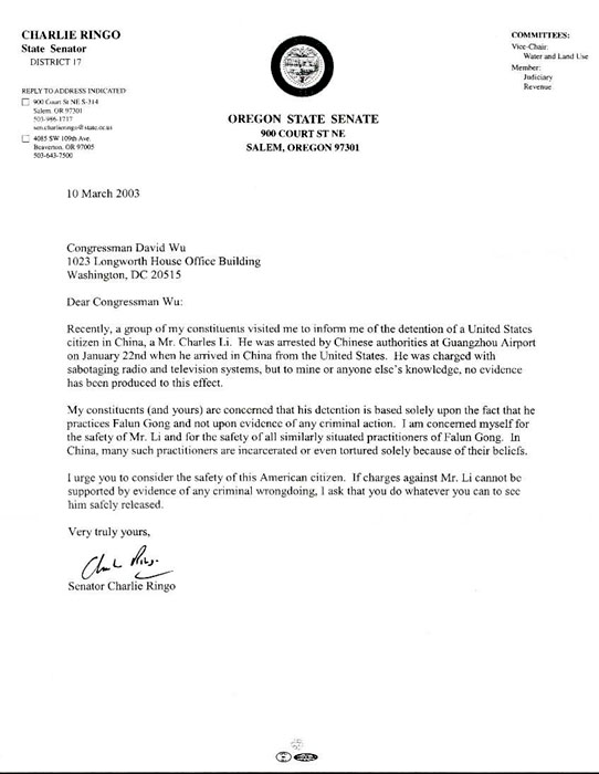 我的(还有你的)选民对于他仅仅由于修炼法轮功而不是由于有任何犯罪行为的证据而被捕非常关注。我自己关注着李先生和所有处于类似情形中的法轮功学员的安全。在中国,很多这样的学员仅仅由于他们的信仰而被监禁甚至受到酷刑折磨。