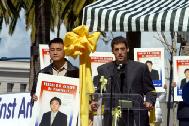 今天的与会者每个人胸前都配戴着黄丝带,黄丝带代表着一个大家共同的愿望:要求中国政府早日停止迫害,让李祥春早日回到美国这片自由的土地上。