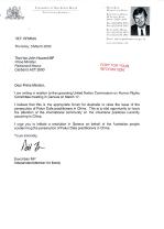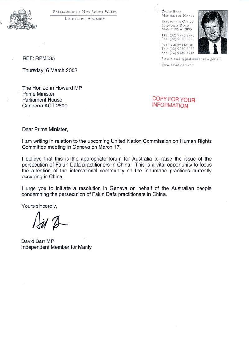 我恳请您在日内瓦代表澳大利亚人民,带头发起一项谴责中国[江氏集团]迫害法轮大法修炼者的决议。