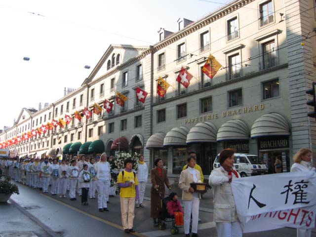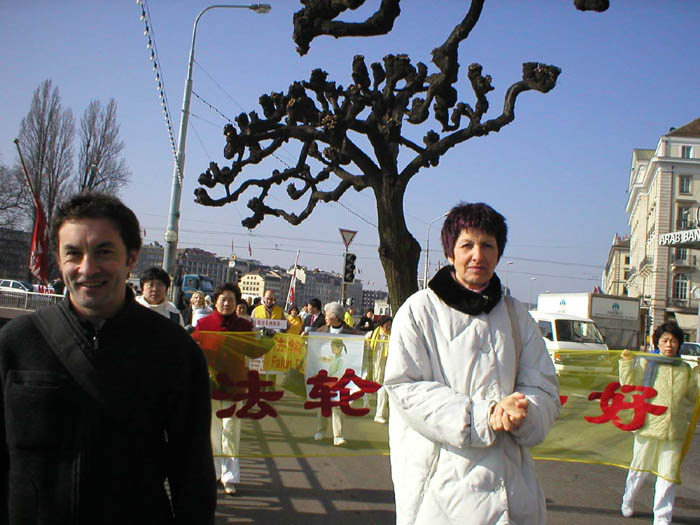 | 法轮功在日内瓦的游行队伍 | 瑞士联邦议会议员兼绿党主席帕特黑斯·穆尼先生在游行队伍中 | 日内瓦市议会议员玛丽亚·保罗·布朗沙库兹夫人(右)、法国绿党亚洲委员会主席让-马克·布鲁莱先生(左)在游行队伍中。 |