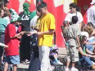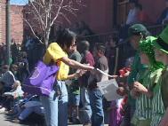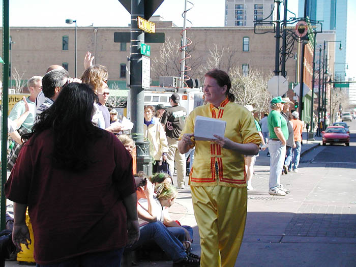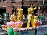 彩车上放着两个莲花台,彩车的尾部挂着用英文写着“真,善,忍”和“法轮大法好”的横幅。一路上,两名东方学员和两名西方学员分别在彩车上作了功法表演。两位东西方女学员分别在莲花台上盘腿打坐,十分优美。有不少游人,包括儿童,认真地模仿着学员的功法动作,有的人竖起大拇指,还有的人挥手致意。