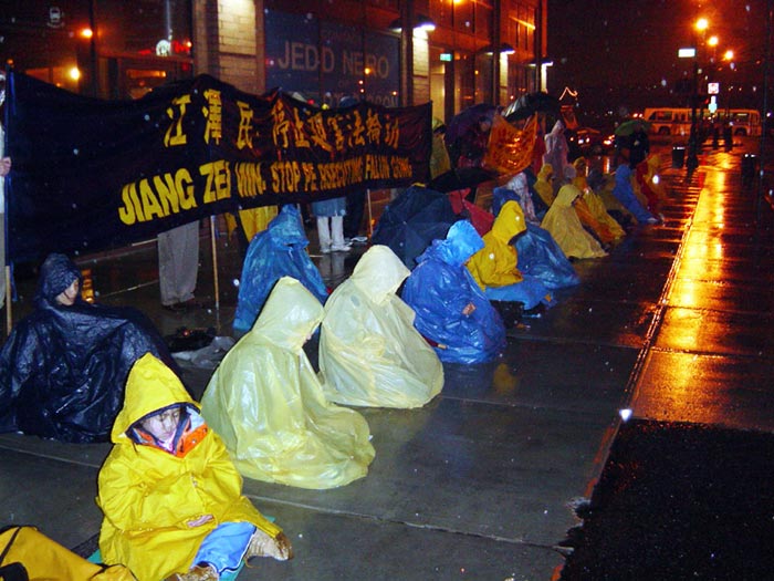 【明慧网2003年3月22日】美国东部时间三月二十日晚,大纽约地区部分法轮功学员再次来到中领馆前,对中国无理拘捕美国公民李祥春,并将进行所谓审判表示强烈的谴责。尽管当晚雨下得很多大,学员们坚持发正念,请愿活动自六点半持续至九点一刻。自由亚洲电台作了电话采访。