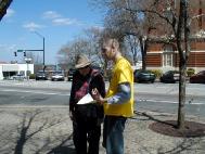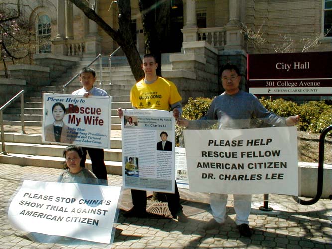 当行人看到展板上亚特兰大学员吕朝晖的妻子周雪菲端正清秀的面庞时,纷纷询问她的情况。吕朝晖向他们介绍道:妻子在未经开庭审判及没有律师辩护的情况下,直接被判三年劳教;如今已经被关超过28个月,在劳教所受到折磨和虐待,并且被强制生产出口产品,现在双目几乎失明。人们听到这些,不停摇头叹息。
