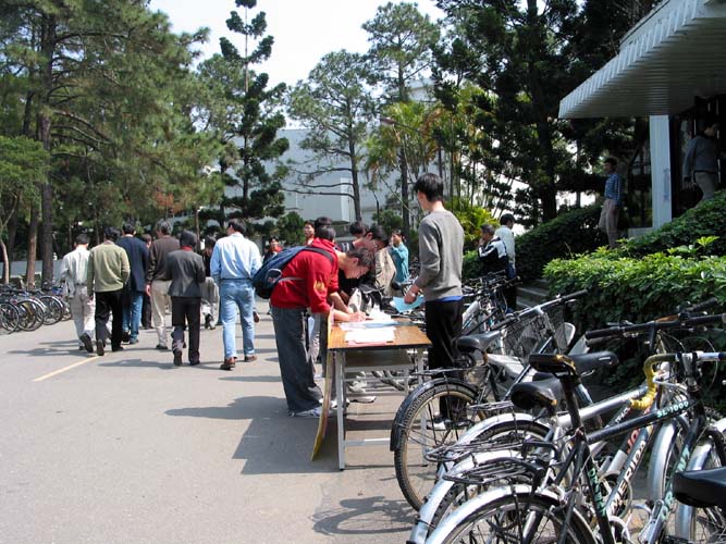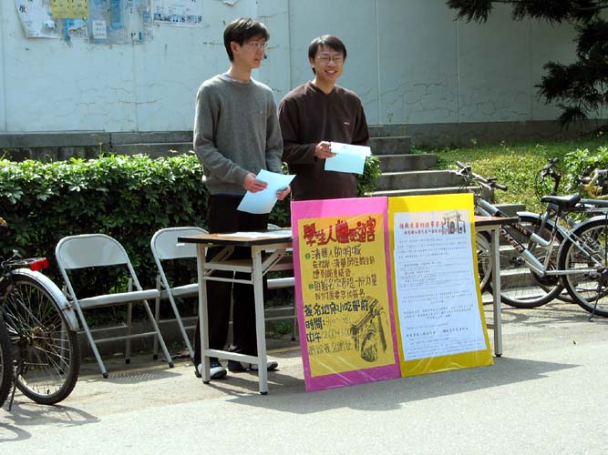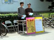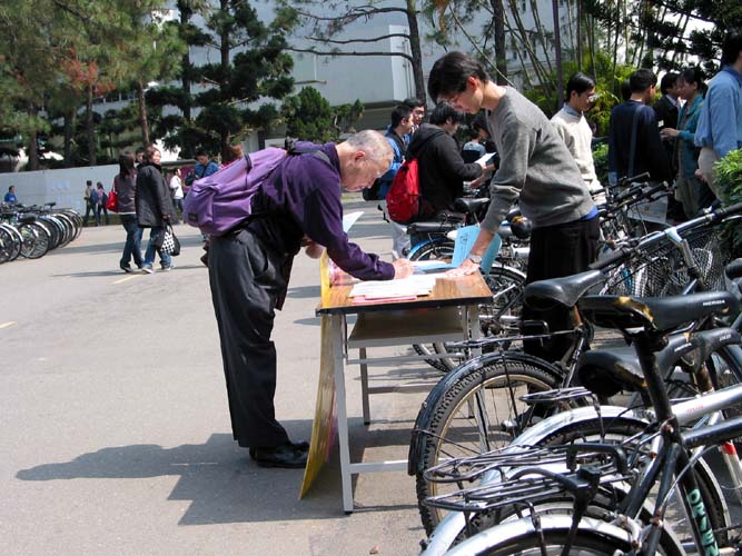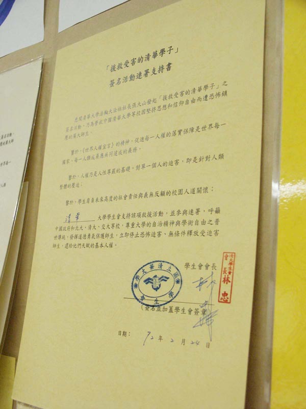 我们在台湾清华大学的小吃部前面摆设了征签摊位,从2月17日至2月21日五天的中午时间向全校师生征签。听过我们说明后的同学几乎都愿意签名表示支持。在最后的两天,我们同时去宿舍征签,遇到的学生几乎个个愿意帮忙。在台湾的这片宝岛,学生们普遍支持人权,对中共的镇压表示不理解。我们也同时将此事告知学生会,让学生会知道同属清华的学生,在大陆上仅仅因为坚持真善忍的信仰,而受到了非法的关押、甚至虐杀。学生会了解情况后表示学生人权应该受到保护和重视,十分支持我们的征签活动。