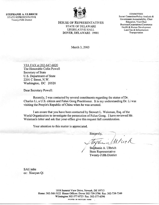 最近,我选区的多位选民就一位美国公民,法轮功修炼者李祥春的情况跟我联系。据我了解,查尔斯.李是在回中华人民共和国探亲时被捕的。