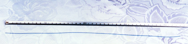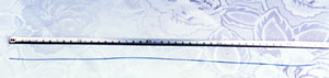 2003年2月17日晚睡觉,我感觉脚后跟上好像扎了个刺,挂住被子时钻心的疼,第二天早晨老伴一看是一个尖刺在外面露着,就拿剪指甲刀夹住想剪下来,可是剪不断,往外拽,越拽越长,竟然拽出一根直径1毫米、长43.5厘米,似乎电线一样的东西。后经到医院了解,才知是一次手术中留在脖子静脉中的导丝(见下图),半年后它居然从脚后跟出来了,这在常人中是不可想象的事情,但在大法弟子身上却奇迹般地出现了。