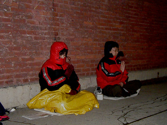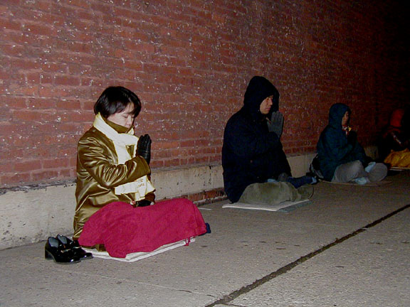 芝加哥学员每天从早到晚持续轮流在中领馆前发正念支持人间的正义审判。老年大法弟子已经坚持白天在中领馆发正念整整一个严冬了,年轻弟子则下班后赶来接替。
