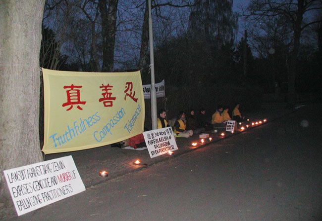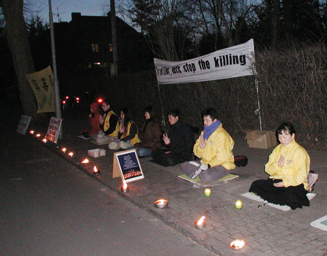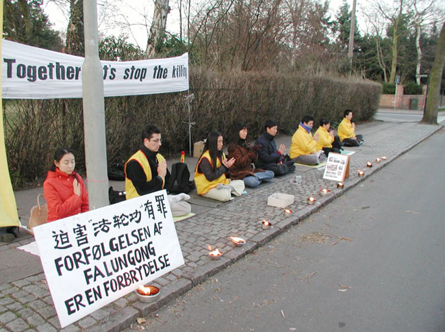 四月初,德国重回严冬,气温下降到零下七八度。但是十四号,星期一,柏林的气温一下子上升到十六七度,并且阳光灿烂。在中国大使馆前,法轮功学员为了声援美国伊利诺依州法庭开庭审判法轮功学员对江泽民以反人类罪,灭绝种族群体罪的起诉举行了静坐活动。中午,郑志红女士在使馆前对记者介绍了这一活动的情况。