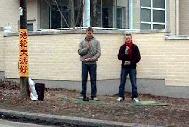 2003年4月14日,芬兰首都赫尔辛基的法轮功学员在中使馆前请愿,呼吁终止迫害法轮功,他们向中使馆人员递送全球控诉中国官员的资料。