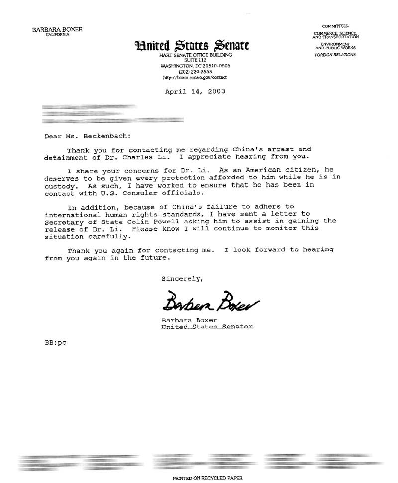 此外,由于中国不遵守国际人权的准则,我已致信给国务卿考林-鲍威尔,要求他帮助李医生获得释放。请您相信我会继续密切注视事态的发展。