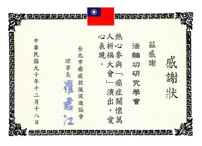 1. 2002年12月18日,台北市癌症救援促进协会感谢状