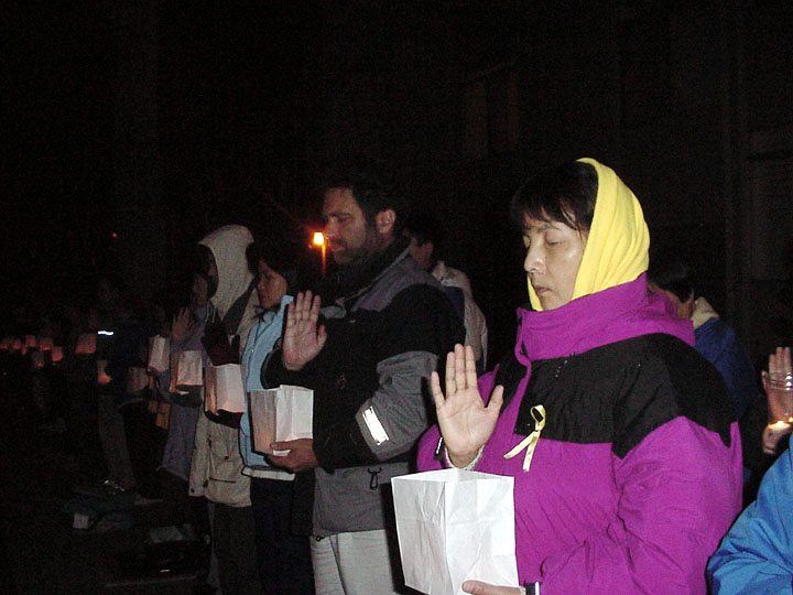 请愿活动从上午10点钟开始,学员们就坐在领馆的对面持续的发正念,夜幕降临后,他们又点燃了一个个烛灯,纪念被江氏集团迫害致死的数百名法轮功学员。请愿活动直至晚上10点钟结束。
