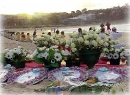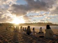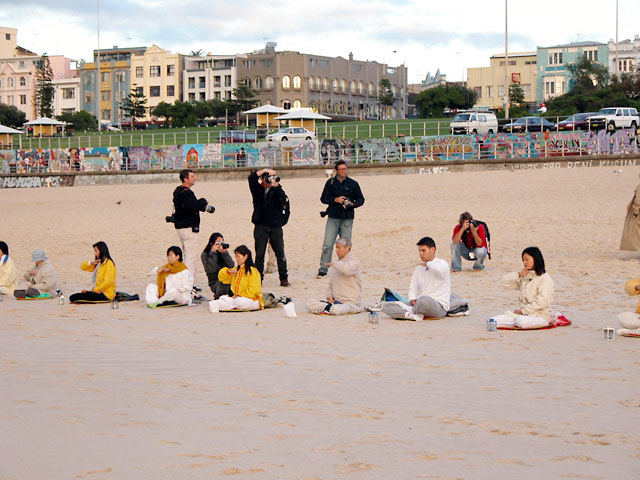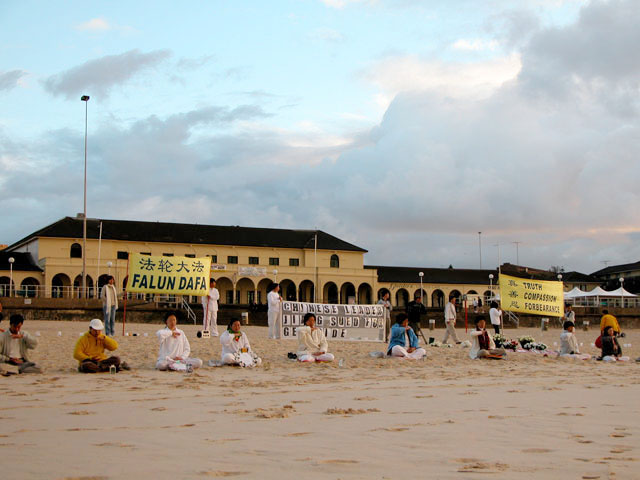 4月26日清晨5点半钟,150多名大法弟子便从四面八方赶到位于悉尼东部的邦地海滩(BONDI BEACH),在黑夜中大家点燃了蜡烛,然后呈一字型沿海滩面朝海水间隔摆开,摆了很长的一条人龙,每人面前放着一盏烛光灯。在人龙队伍的后面中央部位,分别有几位大法弟子拉开了三面横幅“法轮大法好”、“真善忍”、“中国领导人江泽民因灭绝种族罪被起诉”。乌云满天,不见一颗星星,大法弟子身穿素色衣服坐在打坐垫上开始炼第五套功法,并于每个整点发正念除恶。6点半钟,太阳冉冉升起,大法弟子伴随着优美的炼功音乐,伸展、舒缓的炼功,宁静祥和,殊胜肃穆,和整个大自然浑然溶为一体。